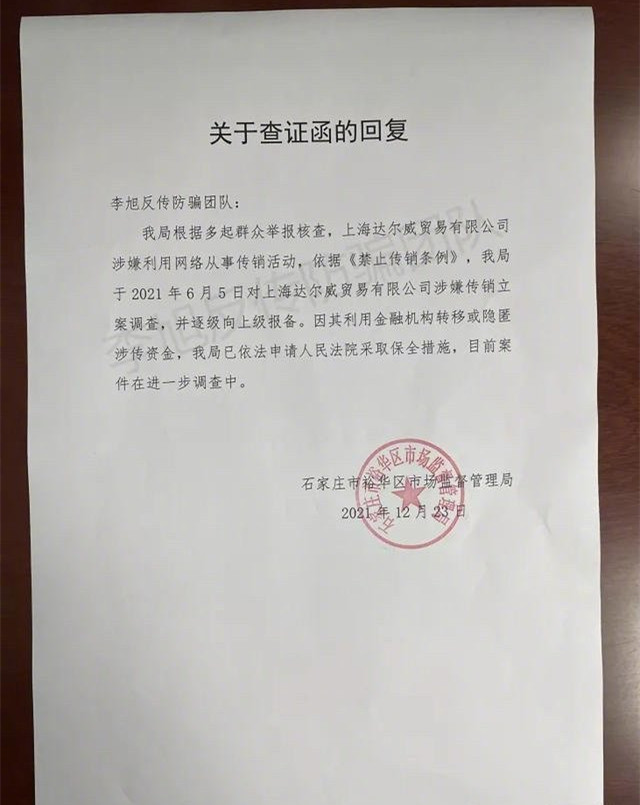 據石家莊市裕華區市場監督管理局對“李旭反傳銷團隊”《查證函》的回復,該局早在今年6月5日就已對上海市達爾威貿易有限公司涉嫌傳銷進行立案調查,“因其利用金融機構轉移或隱匿涉傳銷資金,該局已依法申請人民法院采取保全措施,目前案件在進一步調查中”。有消息稱,石家莊市裕華區市場監督管理局相關人員曾表示,達爾威公司此次被財產保全凍結的資金高達6億元(分兩次凍結,主體公司被凍結3億元,代理商及團隊長被凍結3億元)。
