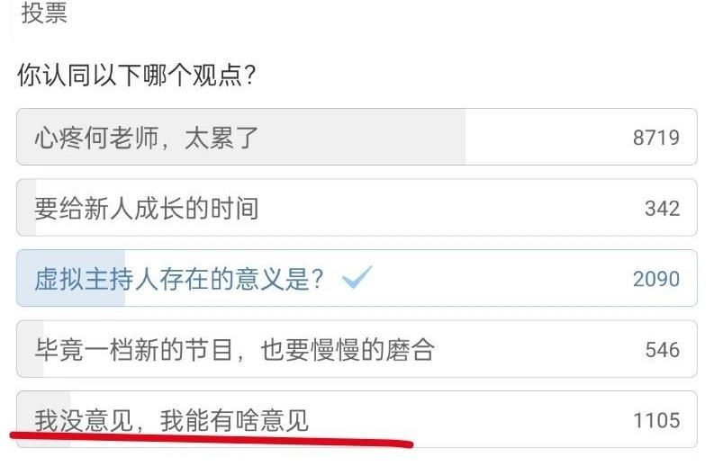 在節目中播出之后,有平臺對此檔節目做出了一個投票,比較多的觀眾提到了何老師和虛擬主持人的問題,這個應該也是節目需要盡快改進的地方,還有一部分的觀眾對這檔節目有一定認同,所以愿意留給節目工作人員磨合的時間,也愿意給新人機會。