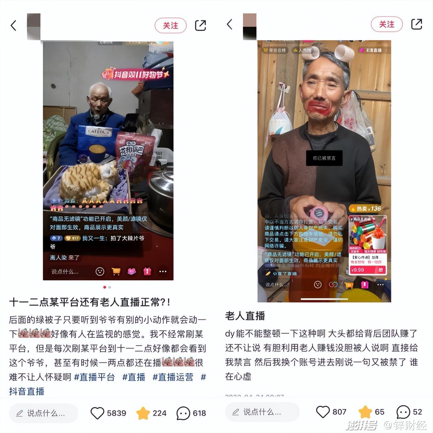 社交媒體上,有不少網友反映,曾在深夜刷到過老人帶貨直播間,但當他們在評論區質疑“凌晨一兩點還讓老人直播合理嗎”“老人家是不是被監視”“這么累了為什么一直站著不能下播”時,就會立刻被禁言或踢出直播間。