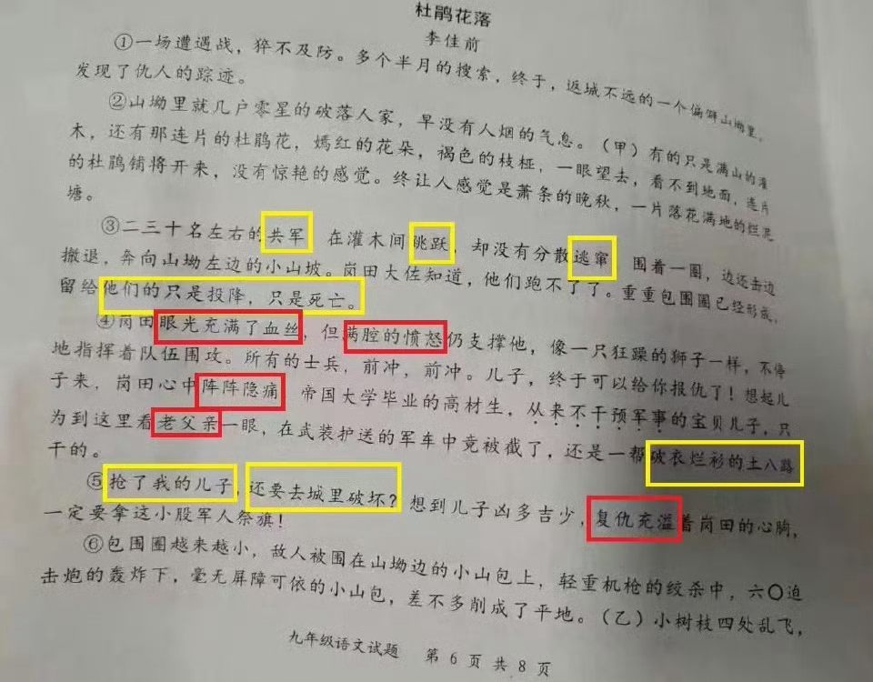 在成都新都區初三年級語文測試中,出現了一篇觸目驚心的文章,名叫《杜鵑花落》??搭}目,不會覺得有啥。但是,結合文章內容,這“杜鵑花”就另有所指了。