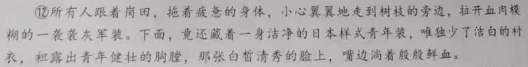日軍是什么形象呢?文章的大佐兒子是這么被描述的:“下面竟還藏著一身潔凈的日本樣式青年裝,唯獨少了潔白的襯衣,袒露出青年健壯的胸膛,那張白皙清秀的臉上,嘴邊淌著汩汩鮮血?!?/span>